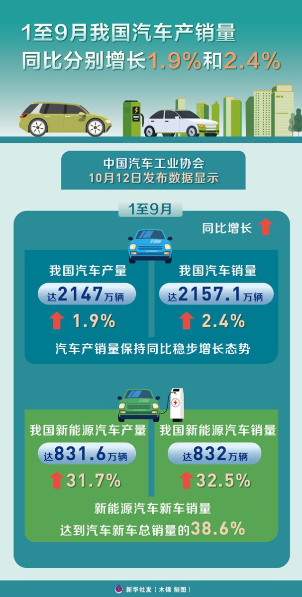 1至9月,我國新能源汽車產(chǎn)銷量達831.6萬輛和832萬輛,同比分別增長31.7%和32.5%,新能源汽車新車銷量達到汽車新車總銷量的38.6%。
